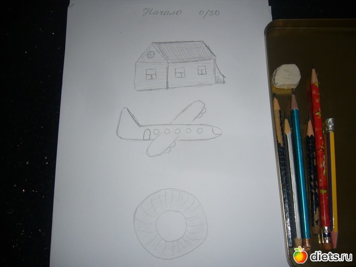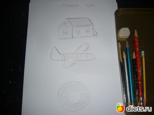Сегодня у меня введение, там задание взять любой карандаш и нарисовать три предмета : дом, самолёт и бублик..
