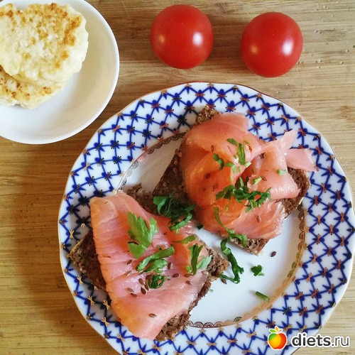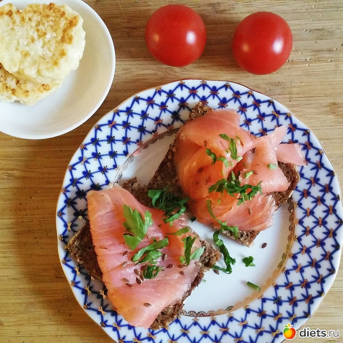 копчённый лосось, 2 помидорки, кофе и вчерашний сырник.