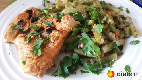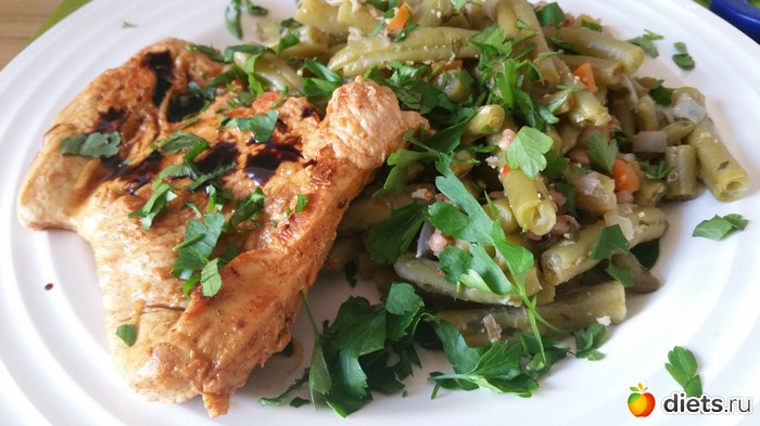 Филе индейки замаринованное и чуть потушеное на сковороде.