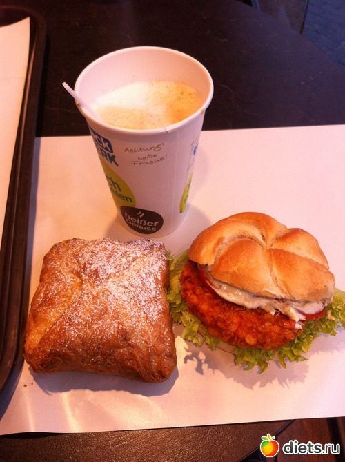 2. бутерброд с куриной котлетой, творожник, молочный кофе