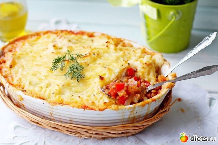 8. Выложить картофельное пюре на чечевицу с овощам. Сбрызнуть 1 ст. л. оливкового масла. Запекать при 180-200 градусах около 20 минут. Картофель должен подрумяниться.