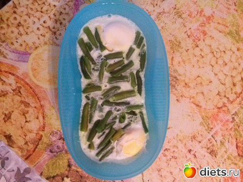 -разбила 2 яйца, посолила, поперчила и добавила немного отварной стручковой фасоли - и получилось все вкусненько и без масла