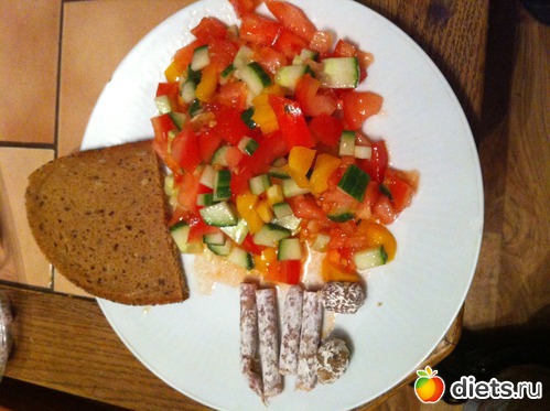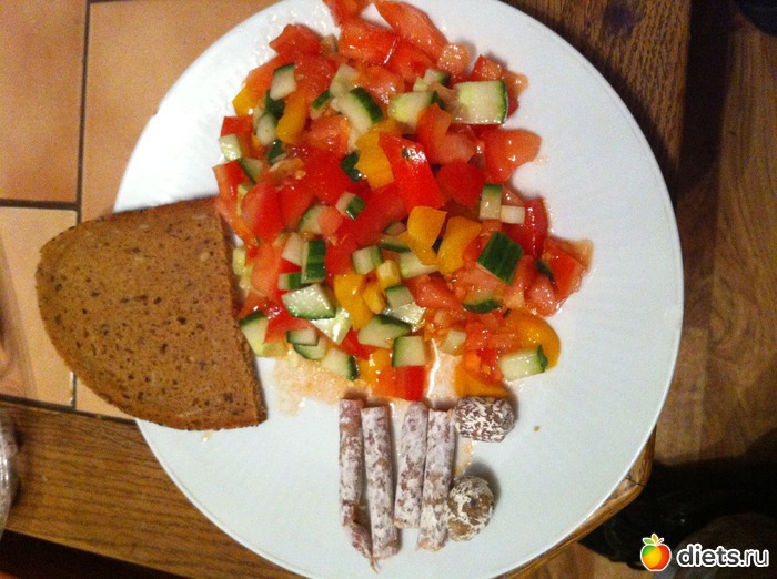 2. салат (помидор, огурец, сладкий перец, оливковое масло), копченая колбаса, хлеб
