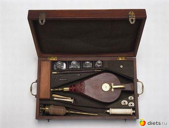 11. Дымная клизма - Устройство её было крайне простым: дымная клизма была похожа на обычную, но вместо груши у нее были меха из свиного желудка, которые подавали табачный дым в задний проход больного. Табак считался неплохим средством от сонливости и простуды и его даже прописывали больным. Такая процедура, как считалось, должна была помогать при болях в желудке, а также оживляла утопленников. Считалось, что дым высушивает всю лишнюю влагу в теле.