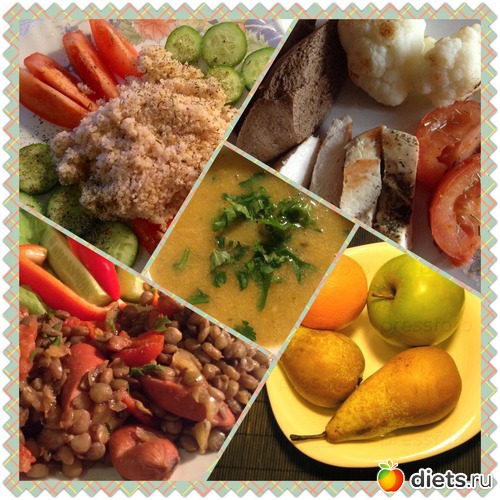 Ужин - чечевица с овощами и сосиской из птичьего мяса; половничек овощного супа-пюре (в общей сложности 300 г еды).