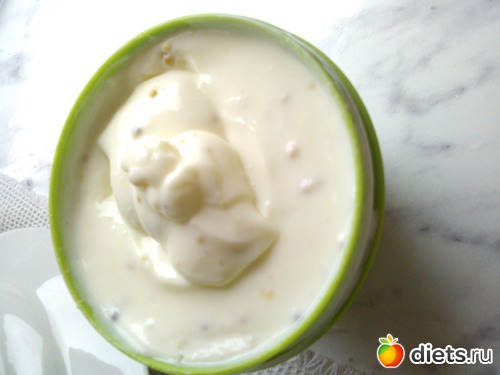 Рецепт (как делала я):В мисочку положила 2 желтка+щепотка соли+1 растертую таблетку сахзама+250г мягкого творожка("Савушка0%")+1ч.л.горчицы(у меня зернистая).Все взбила миксером на большой скорости.Не останавливая миксер влилась 1 ст.л.вазилинового масла и 1ч.л.уксуса9%.Всё забила,попробовала,добавила чеснок и перчик красный