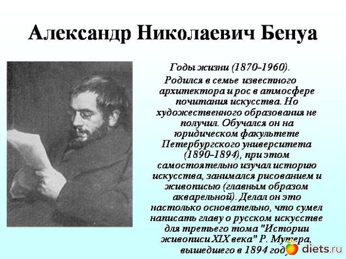 Мне достался - Александр Николаевич Бенуа; (фр. Alexandre Benois; 21 апреля (3 мая) 1870, Санкт-Петербург — 9 февраля 1960, Париж) — русский художник, историк искусства, художественный критик, основатель и главный идеолог объединения «Мир искусства».
