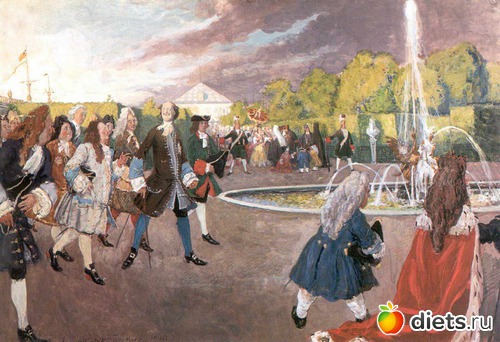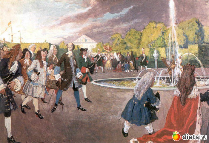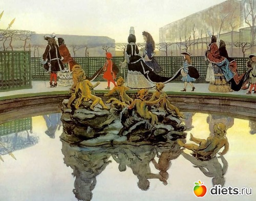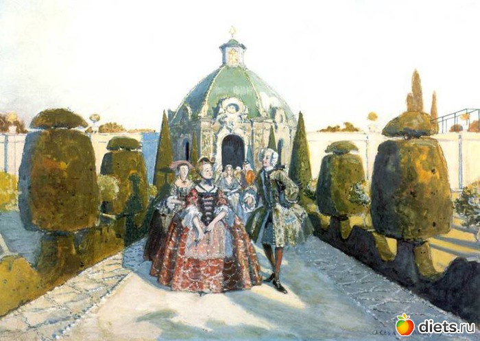 Прогулка короля - Александр Николаевич Бенуа. 1906. Бумага на холсте, акварель, гуашь, бронзовая краска, серебряная краска, графитный карандаш, перо, кисть. 48x62