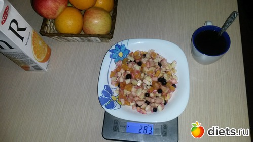 1/2 яблока, апельсин маленький , 1 банан, 2 ст.л. черной смородины + кофе!!!