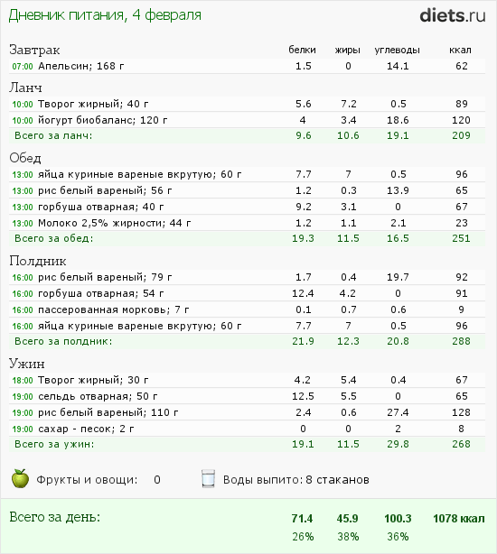 Один день на диете очень меня порадовал, думала будет хуже. Скинула 1,2 кг. Если бы каждый день так, я бы через три недели уже достигла бы результата.