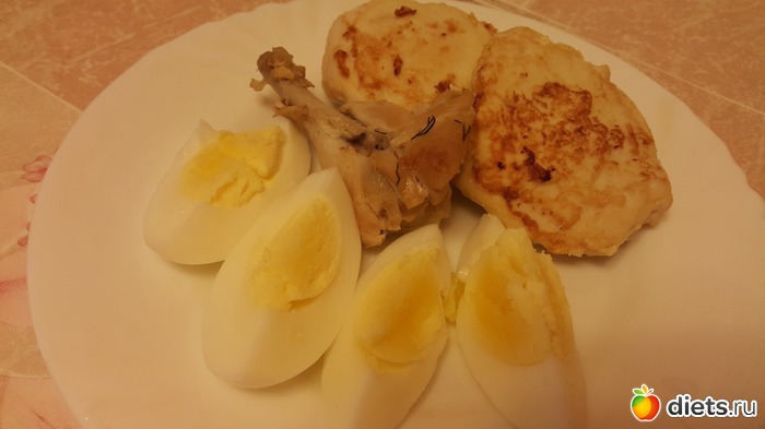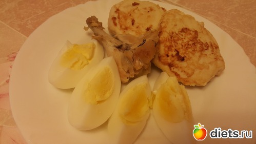Куриные оладьи, кусочек курицы отварной + яйцо