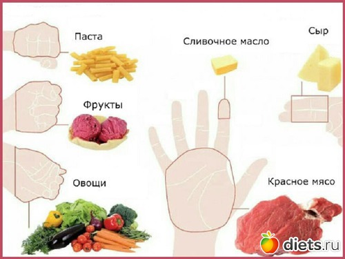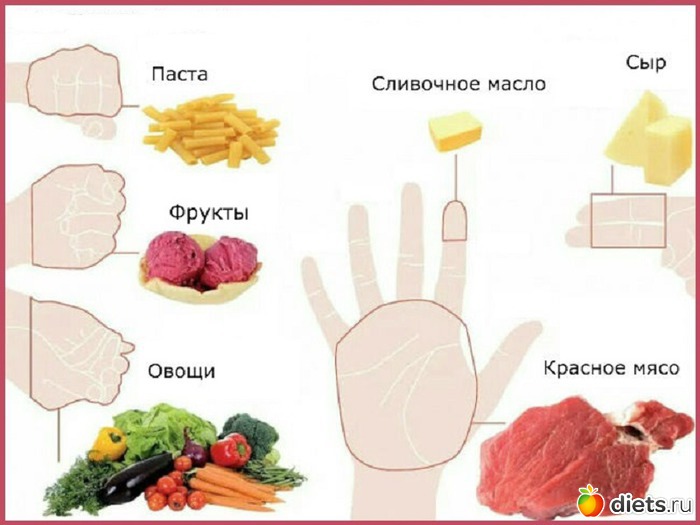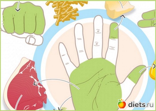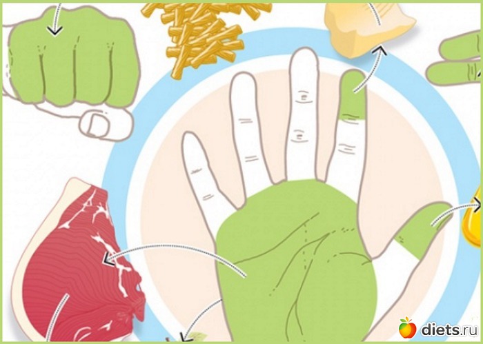 Открытая ладонь без учета пальцев показывает, какой кусочек мяса нужно съедать в день.