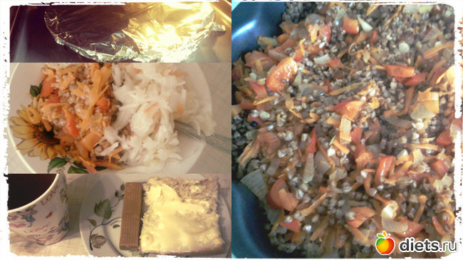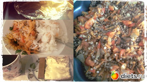 Обед - гречка с овощами ( решила в духовке сделать. нашла рецепт. где нужно фальгой закрывать, вообщем рецепт был с грибами их у меня нет. пришлось довольствоваться обычными овощами. морковка, лук. перец, чеснок.) Вроде не плохо получиось. Мужу прям понравилось. А я бы сказала ну неплохо. но не вау.