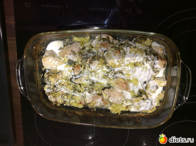 Вышло очень вкусное нежное филе. Блюдо низкокалорийное, так как в него практически не входят никакие жиры. Подойдет для белкового дня. На фото блюдо в сыром и приготовленном виде, запекала в стеклянном лотке.