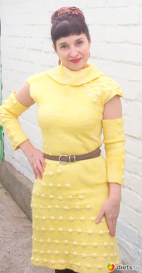 Платье шерстяное, валяное, достаточно теплое и пластичное. На нем вываляны какие-то штучки, не знаю как их назвать. К платью съемные рукавчики.
