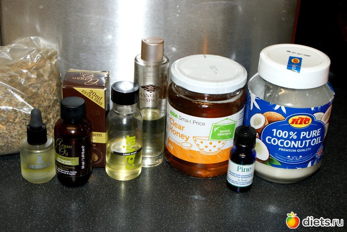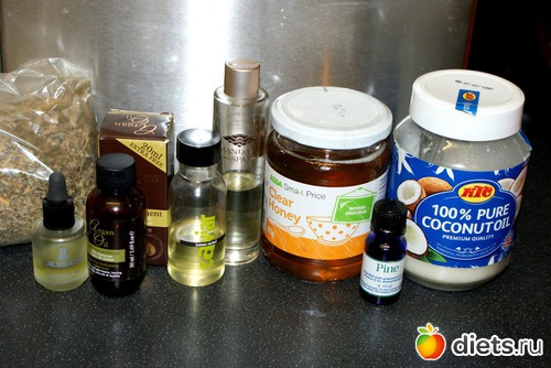 Итак я беру кокосовое мало, желток, мед, и кучу косметических масел, и добавлю в масла наверное сухой травки какой нибудь.
