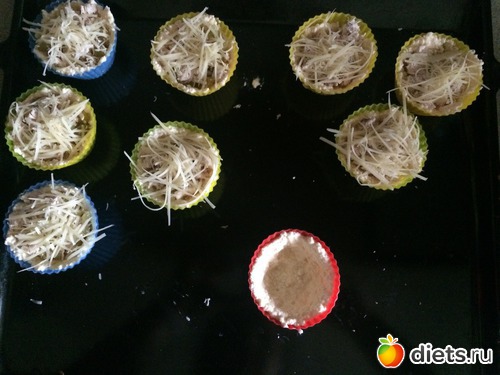 Все перемешать, выстелить этим дно и стенки формочек для кексов( у меня силиконовые, очень удобно). Далее выложить начинку.