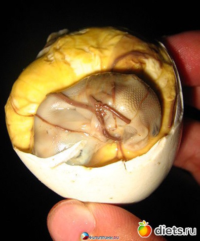 Балут. Это национальное блюдо филлипинцев, распространено повсеместно, и продается как фаст фуд. Яйцо с развивающимся эмбрионом утенка в перышках варят вкрутую, а затем едят из скорлупки. Говорят вкусно!