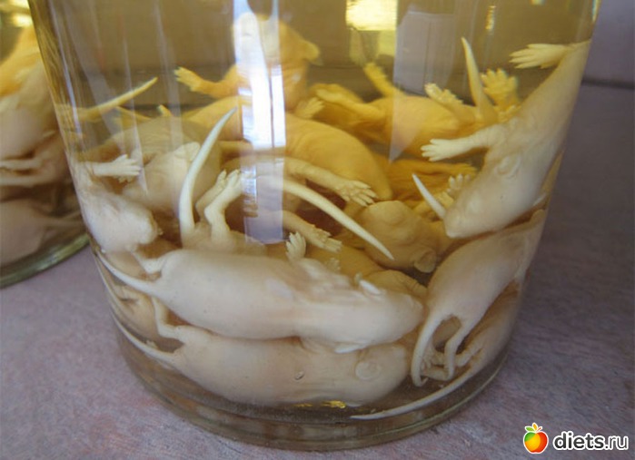 Мышиная настойка. Очень тонизирующий и полезный напиток, попробуйте! Для приготовления потребуется несколько новорожденных лысых мышек и рисовая водка. Вкуснятина готова через год стояния в темном месте. В Корее и Китае – идет на «Ура!»