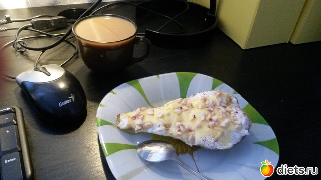 **на перекус сделала, как и хотела, грушу с рикоттой. Одну грушу конференц разрезала на 2 части, вырезала сердцевину, потом намазала обе половинки рикоттой, полила мёдом (на каждую ушло где то 1/2 ч.л. мёда или чуть побольше), посыпала сверху корицей и толченым арахисом и в духовку на 20 мин. Вышло два своеобразных пироженка (одно мне, другое мужу). Вот таких: