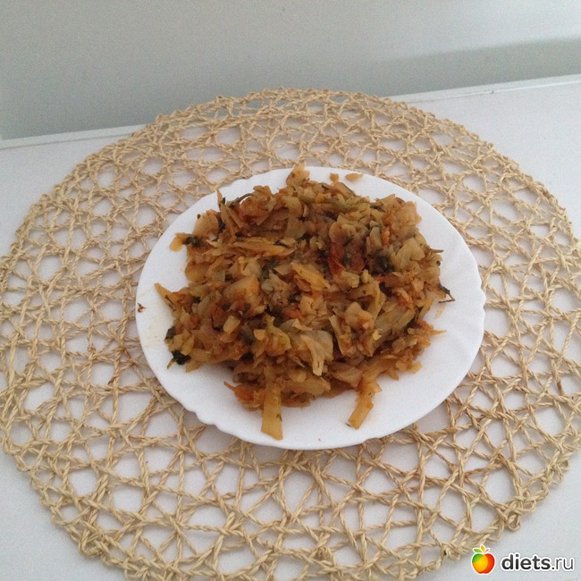 Обед в 14-30: Капуста тушёная без масла в мультиварке (капуста, морковь, лук, укроп, зелень сельдерея, томатная паста, чеснок, вода)