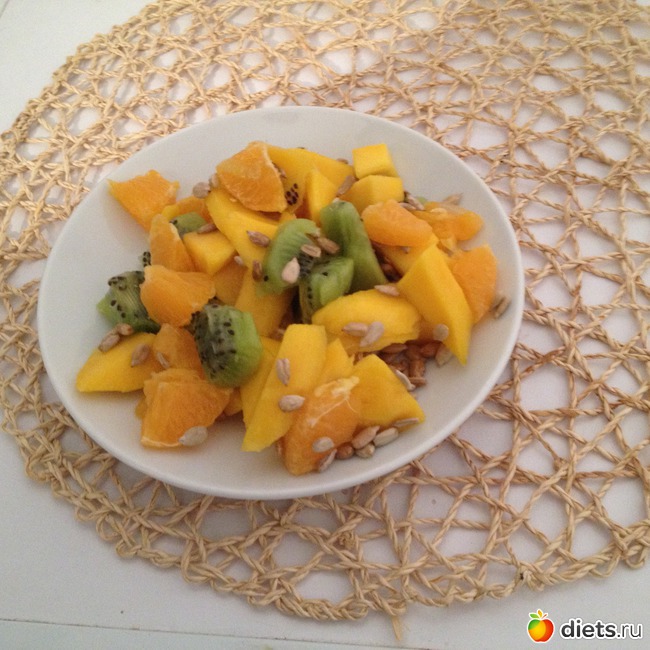 Перекус в 17-00; Фруктовый салат: манго, мандарин, киви, ядра подсолнечника
