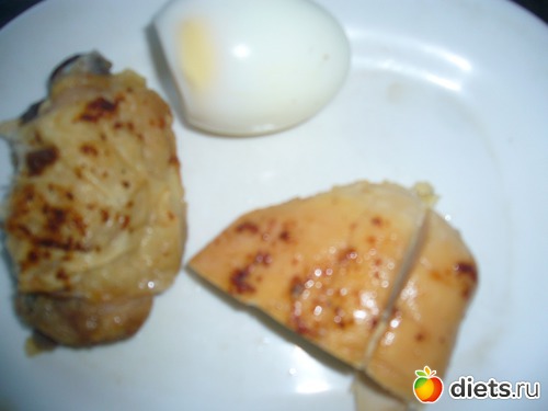 В 11-00 -кусочек куриного бедрышка, кусочек куриной грудки и яйцо