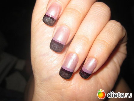 - Обязательная черта нового французского маникюра – темный глянцевый лак по краю (вместо белой полоски в классическом французском маникюре). Варьируйте этот лак и в качестве канта, и в качестве основного оттенка.