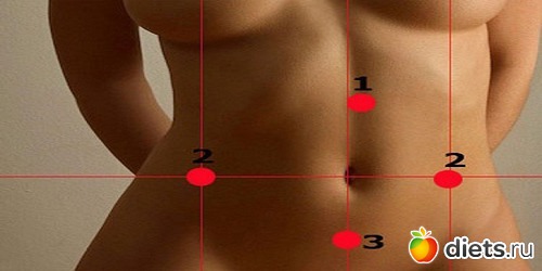Точка 3 — расположена на срединной линии живота на расстоянии 4-х пальцев ниже пупка.