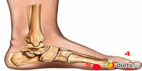 Точка 5 — находящаяся на боковой стороне ступни у основания большого пальца, как раз под выпирающей косточкой сустава.