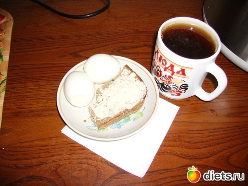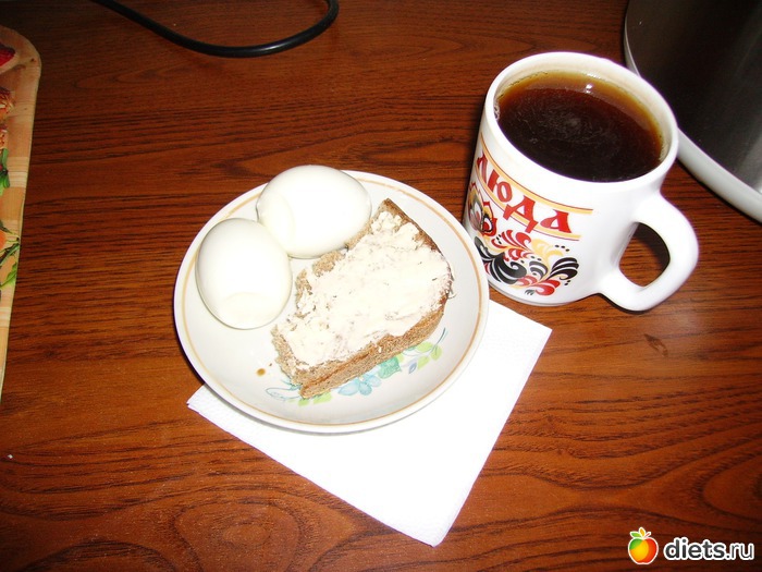 Завтрак- 2 яйца вареных куриных, кусок хлеба с маслом сливочным