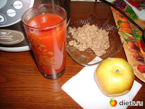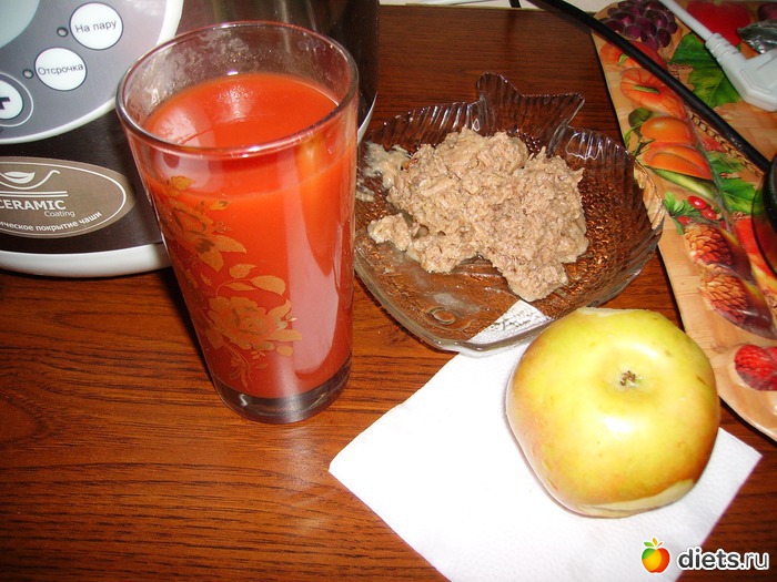 Ужин- Тунец консервированный, томатный сок, яблоко.