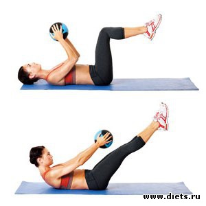 Это не только упражнение для нижнего пресса, это еще и средство поддержать в тонусе мышцы рук и плеч. Вам понадобятся небольшие гантельки 1,5-2 кг.