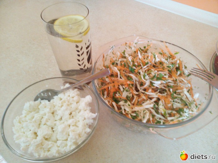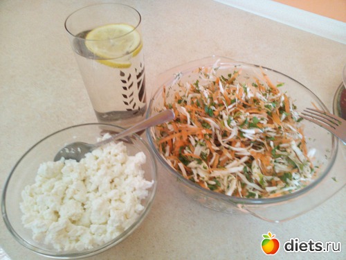 О. Творог 0,5% магазинный, и много салата из капусты и моркови с зеленью, приправлен соком лимона.