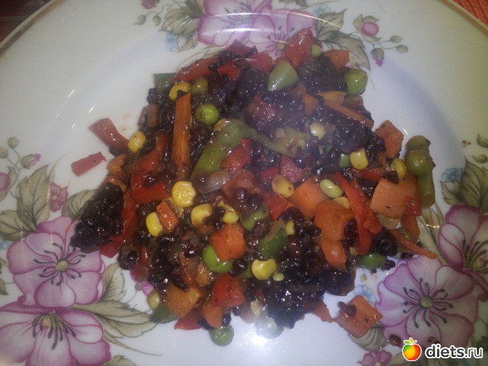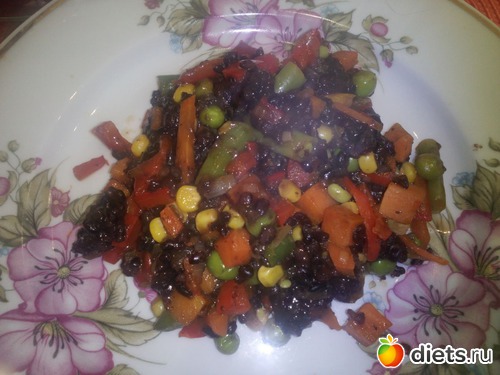 Протушила мексиканскую смесь и добавила уже готовый черный рис (оставался с прошлых крахмалов, заморозила). Приправила соевым соусом - и просто не могла оторваться от блюда!