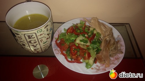 Обед, ужин: вареная курочка, салат ( листья салата, помидор, огурец, перец, зелень и запила бульоном. Ужин без бульона. Ням-ням, наелась!