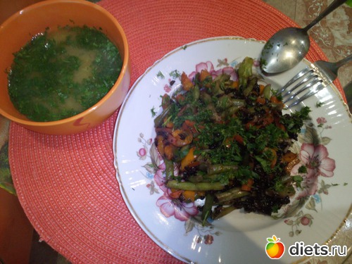 О. Опять сварила свой черный рис, протушила овощи (морковь, сладкий перец, немного лучка, брокколи и стручковая фасоль) - все смешала+немного соевого соуса. Очень мне понравилось в прошлый раз, и в этот огромное удовольствие от блюда получила. В прошлый раз хороший отвес после этого был - НАДЕЮСЬ! Шлифонула обед супчиком (из брокколи, моркови и лука - перебила блендером, но житковат, как бульон больше получился)