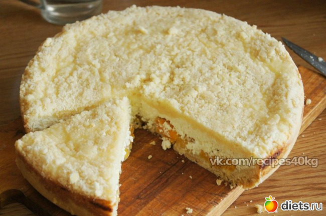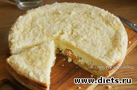 В форму выложить 3/4 части крошки, затем всю творожную массу, на нее-оставшуюся крошку. Печь 35-40 минут при 180°