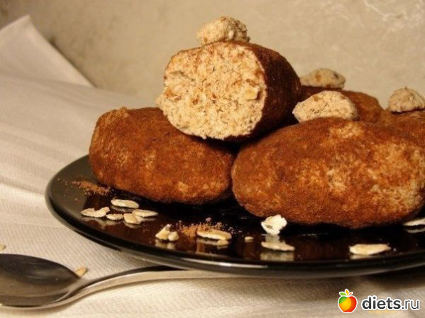 Изюм измельчить блендером в пюре, добавить кофе и еще раз измельчить. К творогу добавить измельченный изюм, коньяк и тщательно перемешать, добавить полученную овсяную муку и еще раз перемешать. Формируем пирожные и обваливаем в какао-порошке. Убрать в холодильник на несколько часов.
