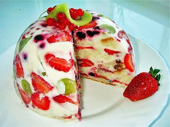 5. В форму (1,5л) желательно пищевой пластик, налить немного йогурта, а далее собрать десерт слоями
