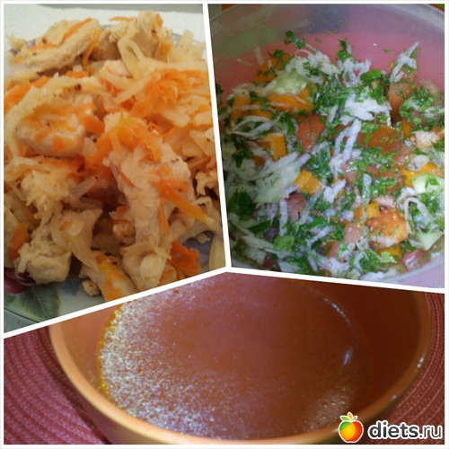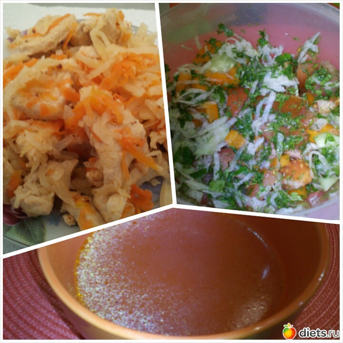 О. тушеные курогрудь+капуста+морковь - что-то не очень понравилось... надо что-то новенькое придумывать...надоела эта курогрудь с овощами. Салат из свежих огурчика+перчик+редьку дайкон натерла+ложка оливкового масла+сок лимона. Бульон от тушения грудки с овощами.