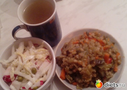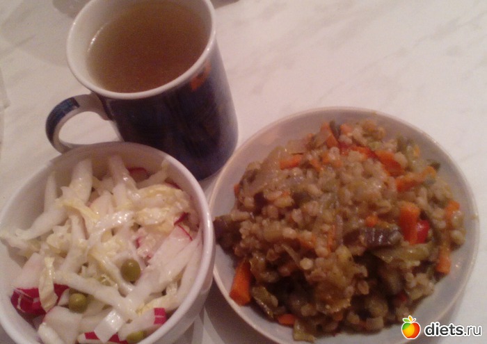 Обед: бульон, салат (редиска+горошек+пекинка+масло), перловка с овощами в мультиварке (морковь, баклажан, лук, болгарский перец), хлеб
