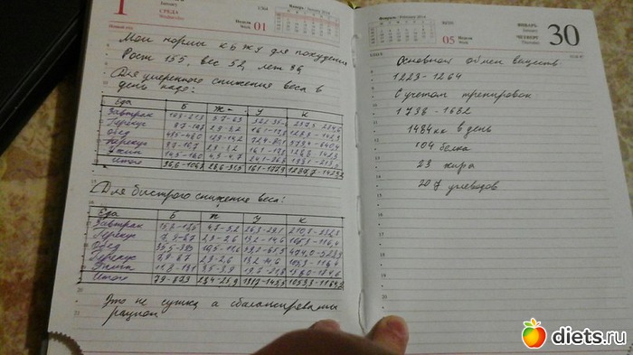 На первых страницах дневника питания я записала свои нормы по КБЖУ. Со временем, понятно, их придется пересматривать. Меняется вес, меняется возраст, меняется подвижность. Летом, например, с началом огорода и сада, активность будет гораздо больше, чем зимой на диванчике и киношками.