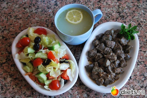 Обед:салат, тушеная печень, бульон(мутный из за лимонного сока, я вместо соли его добавляю)