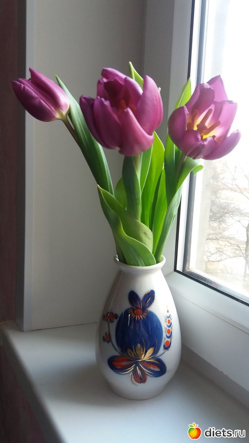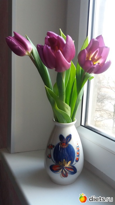 Привет, красотули! У меня сегодня прекрасное настроение, приходила ко мне подруга, просидели с ней 4 часа, расслабились, выпили 1л сухого вина, поздравила она меня с 8 марта, подарила набор бокалов и букет тюльпанов, так приятно