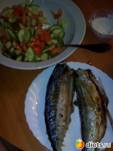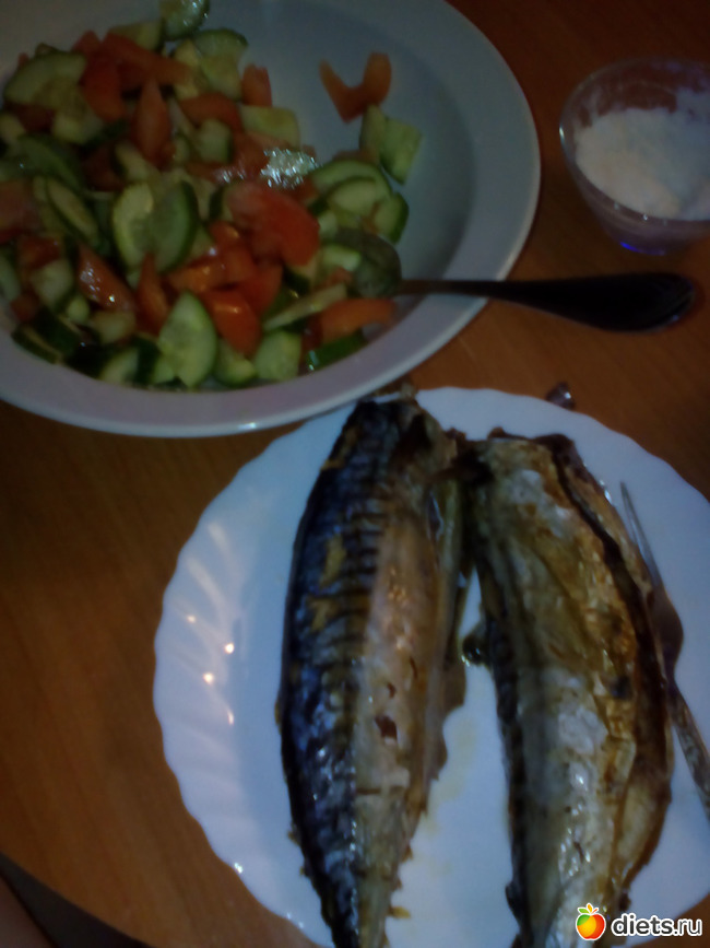 5 маггический день. фото ужина))) Ну что, 5 дней я на пути к стройности. Да, это только начало, но главное, что начало положено! Отвесик сегодня 600 грамм, очень порадовал! День сегодня сытный и вкусный! Обед - зелёная стручковая фасоль и 2 яйца; ужин - скумбрия в рукаве, салатик и грейпфрут! Можно сказать объелась, поэтому завтра ждать отвесов не стоит, но праздник живота тоже иногда нужно устраивать))) Сразу скажу - на фото скумбрии 2 и большая тарелка салата, ела всё со своими детьми, осилила только 1 рыбку)))