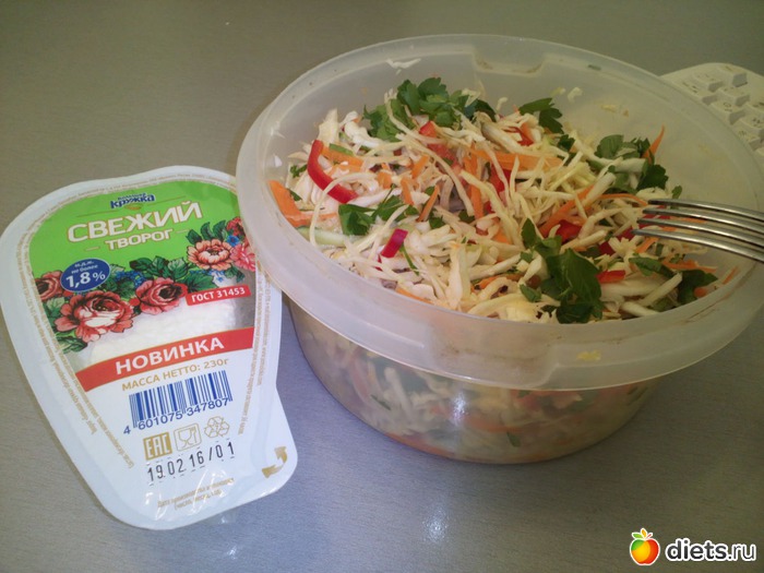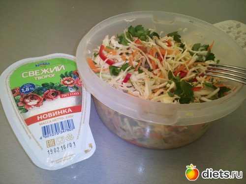 О. Творог низкокалорийный 150 гр. и свежий весенний салат - много. Взяла правда еще кусочек 20 гр. сыр (после прошлого белкового остался), но решила не есть - воздержусь от смешивания и соли.