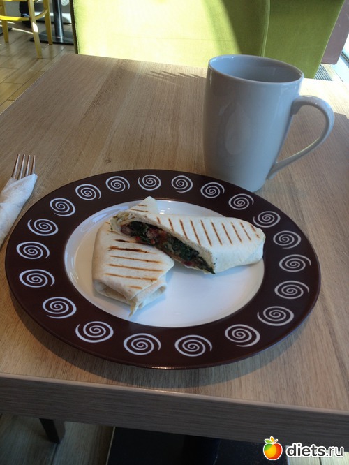 Завтрак. Кафе. Ролы с фасолью и томатами и кофе.