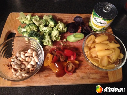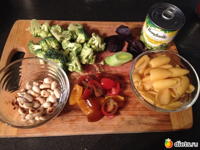 1. Ингредиенты: макароны, брокколи, томаты-черри, лук-порей, зеленый горошек, арахис, базилик, чеснок, соль. Без масла.