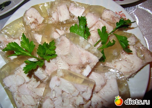 Очень простой рецепт! Примечателен тем, что желатин даже замачивать не надо! И получается очень интересный вид готового продукта: сама "дрожачка"-желе облегает курицу со всех четырёх сторон.